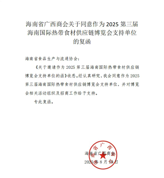 8月19日,海南省廣西商會(huì)復(fù)函同意作為2025第三屆海南國(guó)際熱帶食材供應(yīng)鏈博覽會(huì)(簡(jiǎn)稱“海食會(huì)”)的支持單位,并表示對(duì)博覽會(huì)相關(guān)活動(dòng)組織及招商工作給予支持。